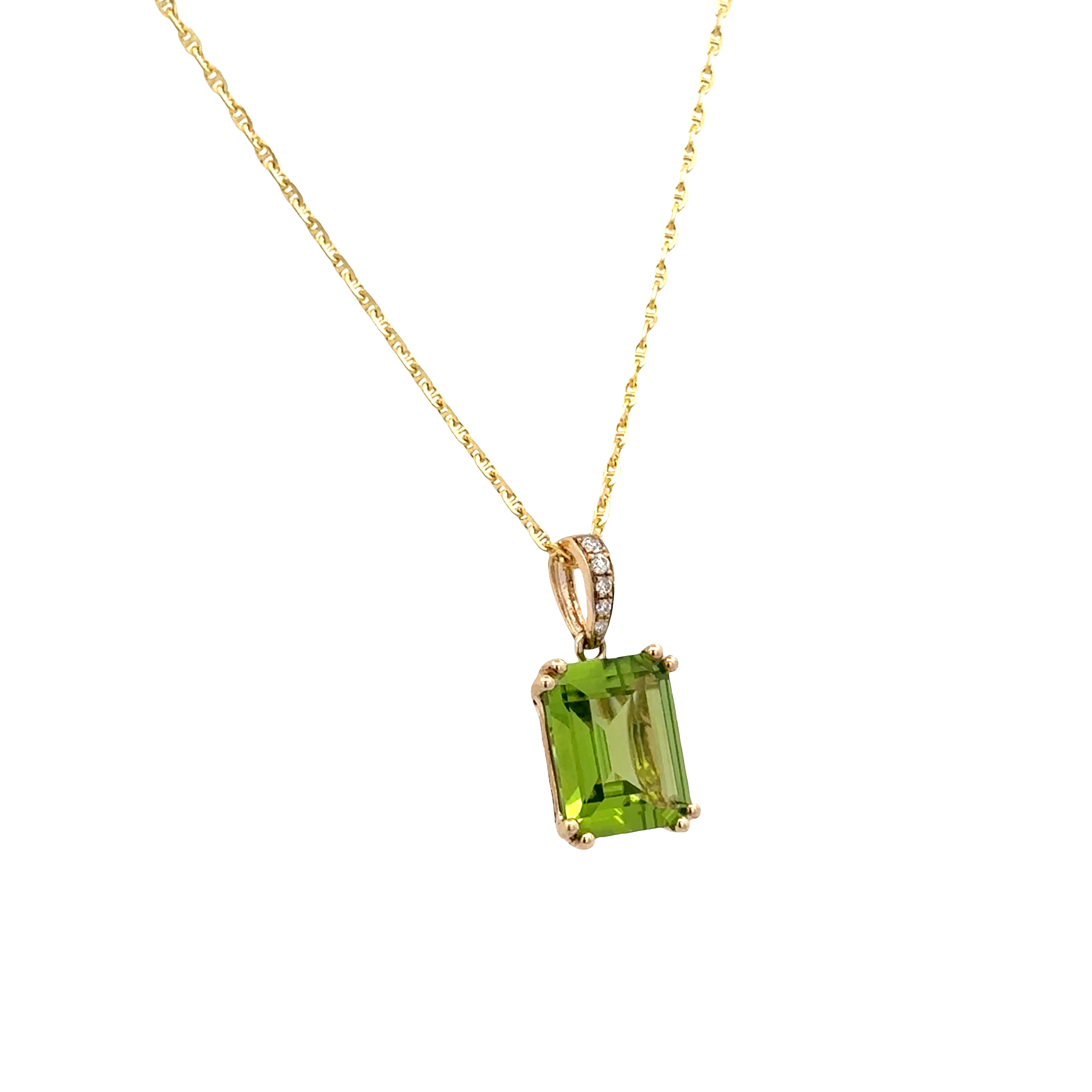 This radiant 14k yellow gold pendant showcases a beautifully faceted emerald-cut peridot weighing 3.55 carats, exuding a refreshing green brilliance that captures the light with every movement. The pendant is elegantly accented with a diamond-accented bail, adding a refined touch of sparkle. The diamonds total 0.03 carat with G color and SI2 clarity, perfectly complementing the vivid hue of the peridot.