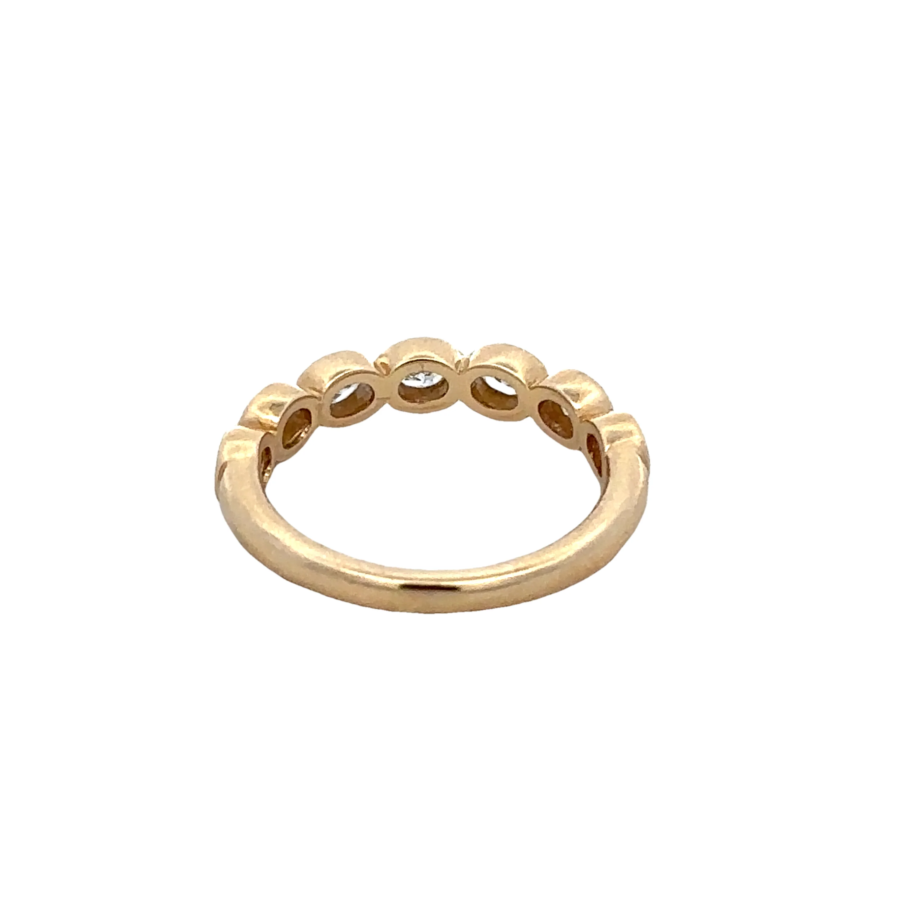 Elegant 14k yellow gold band featuring seven bezel-set oval-cut diamonds with a total weight of 0.70 ct. The diamonds exhibit JK color and SI2 clarity, adding a warm and timeless sparkle. This beautifully crafted ring is a size 6.5 and can be resized for the perfect fit.