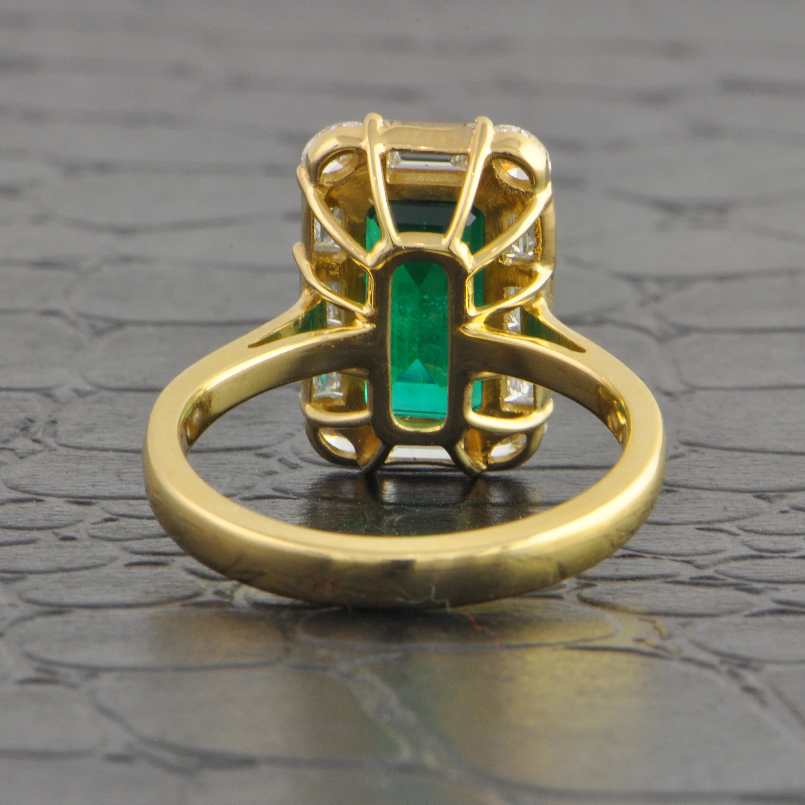14k yellow gold ring centering a 2.84 carat elongated emerald cut emerald framed by a rectangular halo of round and baguette cut diamonds. The diamonds have a total weight of 1.01 ct. with H-J color and VVS2-VS2 clarity,